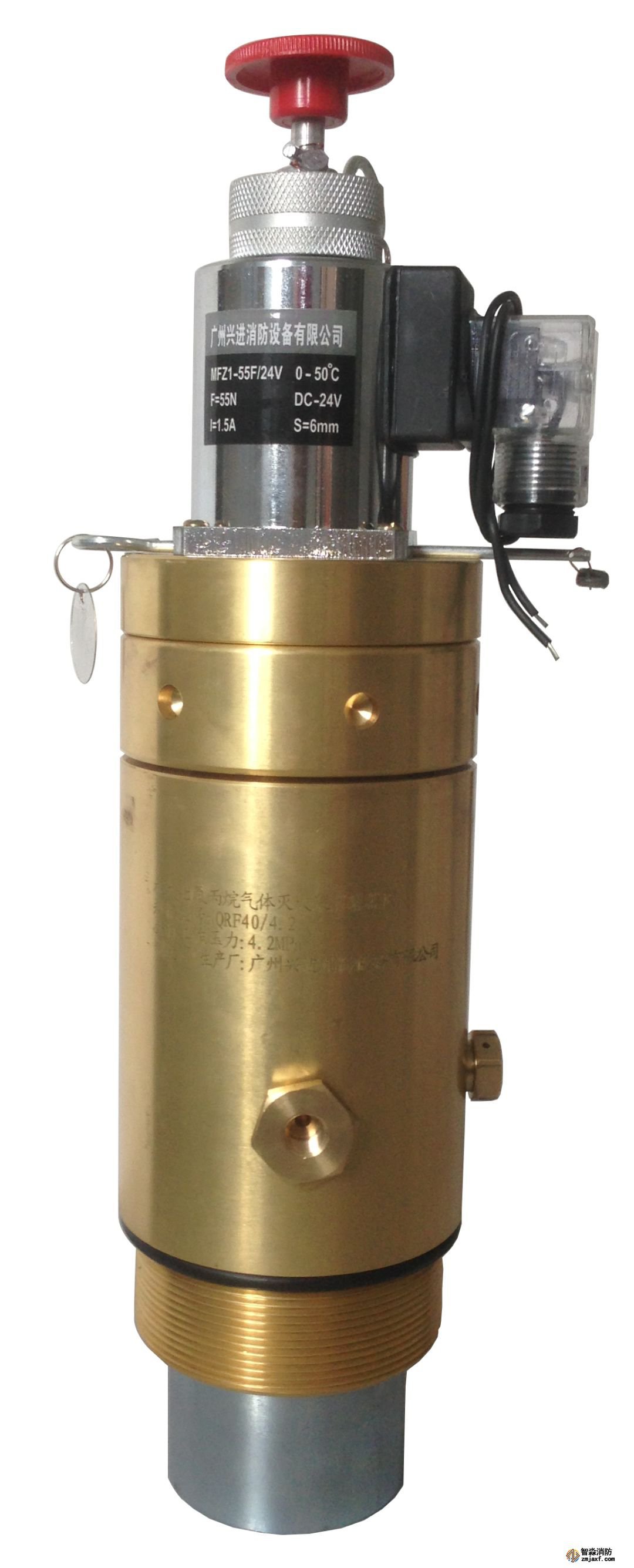 由閥體、電磁鐵、安全檔片、出口接頭、壓力顯示部件、泄壓裝置等組成,接上虹吸管后安裝在貯存容器瓶口上,由電磁鐵電動(dòng)開(kāi)啟容器閥釋放滅火劑。