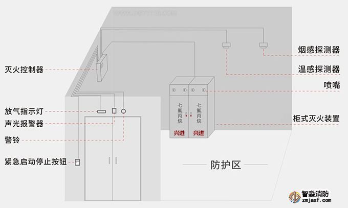 如上圖所示,柜式七氟丙烷滅火裝置放置于防護(hù)區(qū)內(nèi)部,煙感探測(cè)器、溫感探測(cè)器根據(jù)防護(hù)區(qū)需要均勻布置于內(nèi)部,氣體滅火控制器可根據(jù)實(shí)際情況設(shè)置在防護(hù)區(qū)內(nèi)部或外部,放氣指示燈、聲光報(bào)警器、警鈴、緊急啟動(dòng)停止按鈕安裝在防護(hù)區(qū)外。