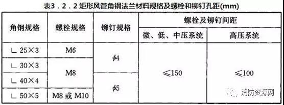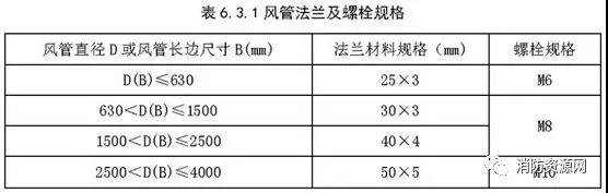 二、金屬風(fēng)管采用法蘭連接時,法蘭材料規(guī)格應(yīng)按《建筑防煙排煙系統(tǒng)技術(shù)標(biāo)準》表6.3.1選用,風(fēng)管接口的連接應(yīng)嚴密、牢固,法蘭墊片應(yīng)為不燃材料(A級),厚度不應(yīng)小于3mm,不應(yīng)凸入管內(nèi)和法蘭外。螺栓孔的間距不得大于150mm,矩形風(fēng)管法蘭四角處應(yīng)設(shè)有螺孔。(6.3.1