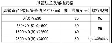 三、薄鋼板法蘭高度及連接應(yīng)按下表規(guī)定執(zhí)行,其螺栓孔的間距不得大于150mm,矩形風(fēng)管法蘭四角處應(yīng)設(shè)有螺孔,法蘭高度h不應(yīng)小于下表值: