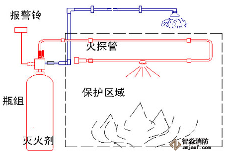 間接式:火探管與滅火介質(zhì)容器閥連接,延伸進(jìn)入保護(hù)空間,進(jìn)行火源探測(cè),遇火時(shí)火探管爆破,火探管中的壓力下降,發(fā)出報(bào)警信號(hào),啟動(dòng)容器閥,通過專設(shè)的釋放管及噴嘴把滅火劑釋放出來,實(shí)現(xiàn)滅火。間接式適用于滅火空間較大的場(chǎng)所。