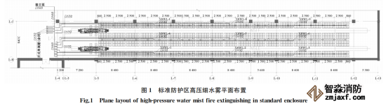 高壓細(xì)水霧泵組、穩(wěn)壓泵、增壓泵、消防水箱設(shè)置在地下室泵房內(nèi),通過管道連接防護(hù)區(qū)外設(shè)置的區(qū)域控制閥箱,由閥箱控制噴頭的開啟。書庫噴頭間距不大于2.5 m,相鄰保護(hù)區(qū)設(shè)置加密噴頭,間距宜為1.25~1.50 m。標(biāo)準(zhǔn)防護(hù)區(qū)高壓細(xì)水霧平面及系統(tǒng)示意分別見圖1和圖2。