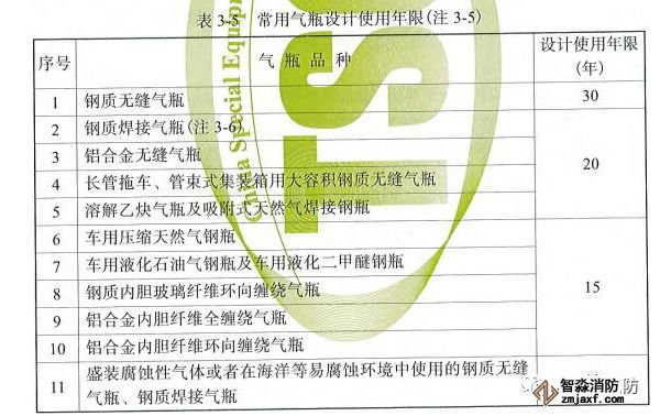 根據(jù)規(guī)程中表3-5,氣體滅火系統(tǒng)的儲氣瓶有無縫鋼瓶和焊接鋼瓶,使用年限分別為30年和20年,而這些數(shù)據(jù)根據(jù)該規(guī)程要求在出廠時應(yīng)作為永久性標(biāo)志刻在鋼瓶瓶身,仔細(xì)觀察,可以在瓶身上看到氣瓶的設(shè)計使用年限。