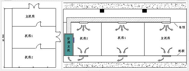 如下圖所示,若三個房間從吊頂?shù)降匕宥疾捎锚毩⒌目照{系統(tǒng),那么將機房1和機房2劃作一個區(qū)域或劃為兩個單獨滅火區(qū)都是可行的。但如果采用一臺精密空調為三個房間服務且為“上送風,地板下回風”方式這三個房間就必須劃分成一個滅火區(qū)域,藥劑儲備應該是上者的3倍或1.5倍,對工程的投資影響是比較大的。除過滅火劑和噴放管道布置要作為一個保護區(qū)考慮外,探測范圍也應該分塊進行探測但還是一個探測區(qū)域,警報區(qū)域也應該按照一個區(qū)域來設置和聯(lián)動。